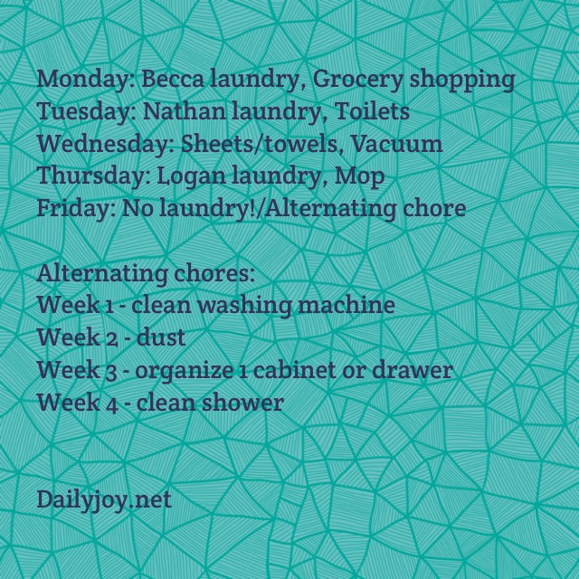 2. I only focus on what needs to be done for the day I am on. I do not start another activity if my “jobs” for the day aren’t finished. I am ADD when it comes to this and I have to be disciplined in this area or I end up with a lot of things done not so well rather than a few things done well. When all laundry is put away for the day and my chore is done, then I can tackle something else. I usually don’t want to though! 😉